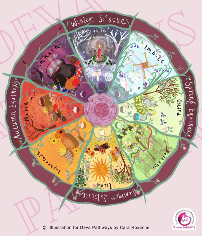 • Places the Map of Woman (Maiden · Mother · Queen · Crone) onto Gaia’s Wheel of the YearÂ